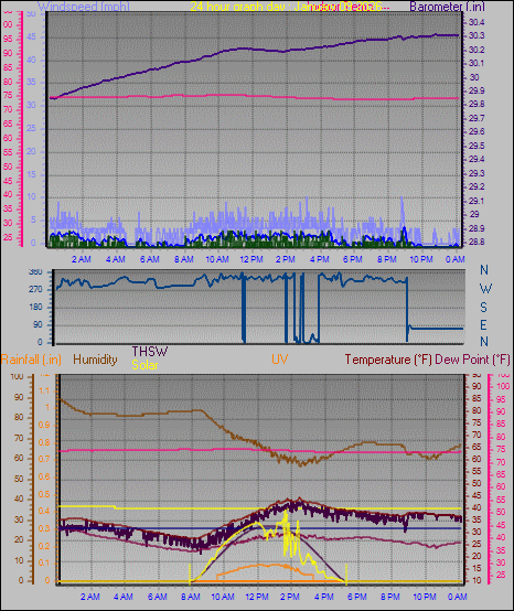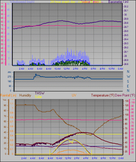 Averages and Extremes for day :03 ------------------------------------------------------------ Average temperature = 32.1°F Average humidity = 84% Average dewpoint = 27.7°F Average barometer = 30.1 in. Average windspeed = 0.8 mph Average gustspeed = 1.7 mph Average direction = 145° ( SE) Rainfall for month = 0.00 in. Rainfall for year = 0.00 in. Rainfall for day = 0.00 in. Maximum rain per minute = 0.00 in. on day 03 at time 23:59 Maximum temperature = 41.8°F on day 03 at time 15:58 Minimum temperature = 22.7°F on day 03 at time 07:48 Maximum humidity = 91% on day 03 at time 09:03 Minimum humidity = 73% on day 03 at time 15:59 Maximum dewpoint = 34.3°F on day 03 at time 14:54 Minimum dewpoint = 19.7°F on day 03 at time 7:30 Maximum pressure = 30.188 in. on day 03 at time 11:04 Minimum pressure = 30.083 in. on day 03 at time 00:38 Maximum windspeed = 5 mph on day 03 at time 13:30 Maximum gust speed = 7 mph from 214 °( SW) on day 03 at time 13:48 Daily wind run = 018.1miles Maximum heat index = 41.8°F on day 03 at time 15:58 Click here for todays 24 hour graph :3 :1 :2026