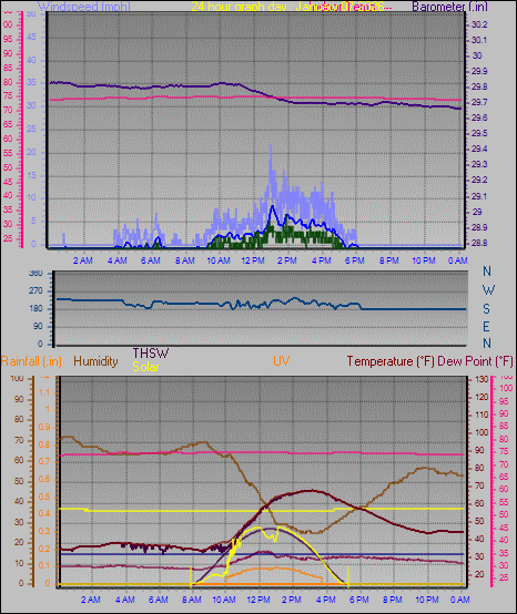 Averages and Extremes for day :07 ------------------------------------------------------------ Average temperature = 47.0°F Average humidity = 52% Average dewpoint = 28.9°F Average barometer = 29.8 in. Average windspeed = 1.4 mph Average gustspeed = 2.7 mph Average direction = 208° (SSW) Rainfall for month = 0.00 in. Rainfall for year = 0.00 in. Rainfall for day = 0.00 in. Maximum rain per minute = 0.00 in. on day 07 at time 23:59 Maximum temperature = 67.9°F on day 07 at time 15:10 Minimum temperature = 34.0°F on day 07 at time 08:34 Maximum humidity = 72% on day 07 at time 00:52 Minimum humidity = 25% on day 07 at time 15:43 Maximum dewpoint = 34.9°F on day 07 at time 12:30 Minimum dewpoint = 24.6°F on day 07 at time 8:13 Maximum pressure = 29.834 in. on day 07 at time 00:32 Minimum pressure = 29.664 in. on day 07 at time 23:50 Maximum windspeed = 10 mph on day 07 at time 12:57 Maximum gust speed = 22 mph from 230 °( SW) on day 07 at time 13:01 Daily wind run = 033.8miles Maximum heat index = 67.9°F on day 07 at time 15:09 Click here for todays 24 hour graph :7 :1 :2026