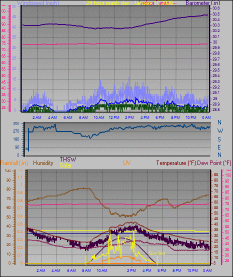 Averages and Extremes for day :12 ------------------------------------------------------------ Average temperature = 42.4°F Average humidity = 62% Average dewpoint = 28.9°F Average barometer = 30.2 in. Average windspeed = 1.1 mph Average gustspeed = 2.3 mph Average direction = 218° ( SW) Rainfall for month = 0.76 in. Rainfall for year = 0.76 in. Rainfall for day = 0.00 in. Maximum rain per minute = 0.00 in. on day 12 at time 23:59 Maximum temperature = 62.1°F on day 12 at time 14:36 Minimum temperature = 28.3°F on day 12 at time 08:19 Maximum humidity = 85% on day 12 at time 02:44 Minimum humidity = 26% on day 12 at time 14:45 Maximum dewpoint = 33.5°F on day 12 at time 15:52 Minimum dewpoint = 24.1°F on day 12 at time 8:19 Maximum pressure = 30.306 in. on day 12 at time 00:13 Minimum pressure = 30.005 in. on day 12 at time 23:59 Maximum windspeed = 6 mph on day 12 at time 14:50 Maximum gust speed = 12 mph from 240 °(WSW) on day 12 at time 14:55 Daily wind run = 026.7miles Maximum heat index = 62.1°F on day 12 at time 14:36 Click here for todays 24 hour graph :12 :1 :2026