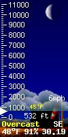 NWS forecast: A chance of showers and thunderstorms before 11pm, then a chance of showers and thunderstorms between 11pm and midnight, then a slight chance of showers and thunderstorms. Mostly cloudy. Low around 62, with temperatures rising to around 64 overnight. South wind 15 to 20 mph, with gusts as high as 33 mph. Chance of precipitation is 30%. New rainfall amounts between a tenth and quarter of an inch possible. WXSIM forecast: Mostly cloudy to cloudy in the evening, becoming cloudy after midnight. A chance of rain. Thunderstorms very likely, some possibly severe. Breezy and mild. Low 63°. Wind south-southeast around 16 mph, gusting to 23 mph. Chance of precipitation 50 percent. Precipitation mostly less than a quarter of an inch.